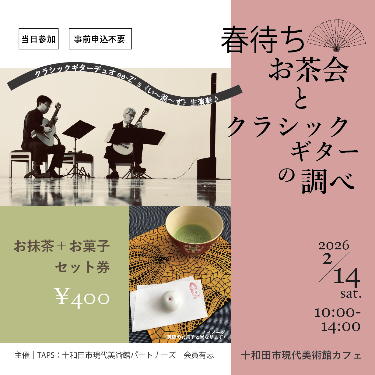 会場では、TAPSメンバーでもある「クラシックギターデュオea-Z’s《い~爺~ず》」がクラシックギターを生演奏いたします。