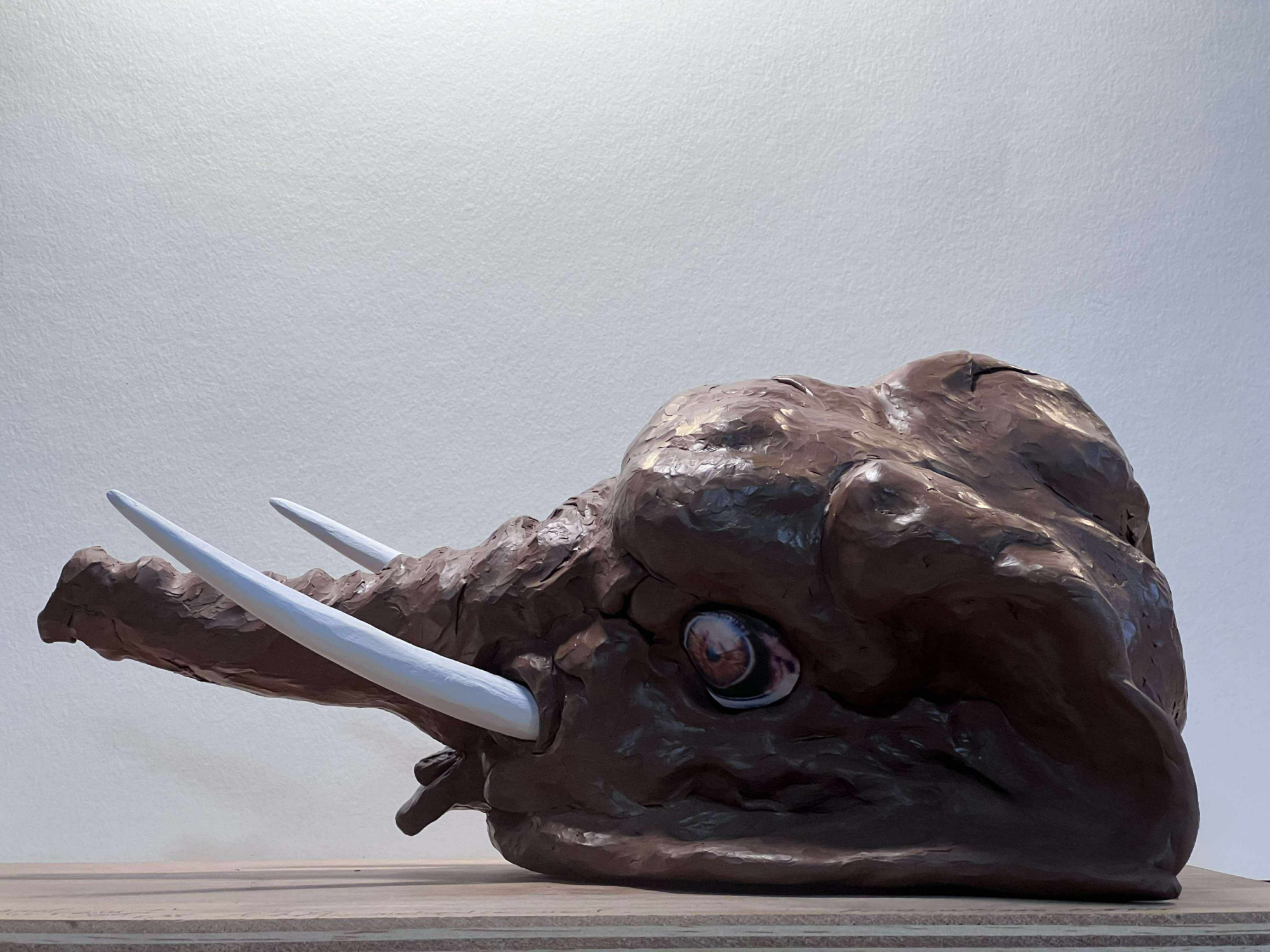 こうしたある昼下がり、陸上哺乳類で最⼤の象とムガール帝国の象使いの囁きが降りてきた。あの空間に象の頭部が2個転がっているのは最⾼だ‧‧‧。そのとき、キュレーターの⻑尾さんが知らせてくれて。以前台湾で展⽰をした時*、脳科学者の茂⽊健⼀郎さんが僕の作品について書いたテキストの中で“the elephant in the room”という⾔葉を使ってたのだと。へーなんと素晴らしい偶然(僕が忘れてただけ‧‧‧)だと思えたのは、遺伝⼦にマンモスを追ってシベリアに移動した祖先の痕跡があるとデータ会社の資料にあったことも遠因。